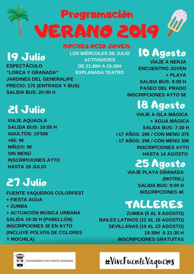 Hace unos días se publicó en redes sociales la programación del verano 2019, la cual cuenta con un compendio de actividades lúdico-deportivas, que van desde talleres de bailes hasta viajes a la playa, Isla Mágica, Nerja y playa granada.